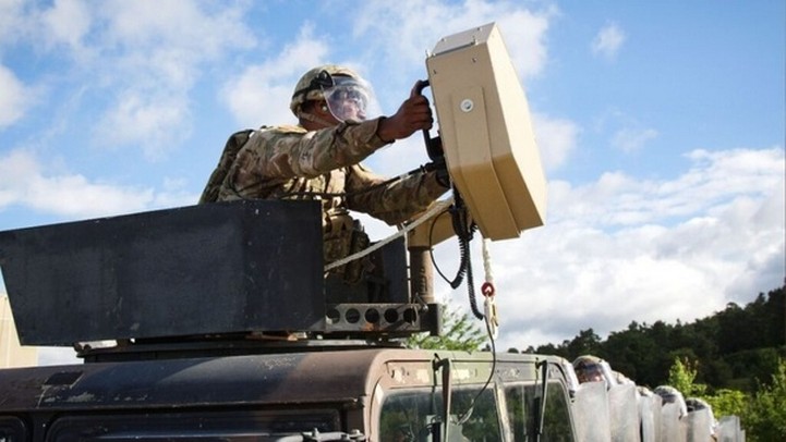 Un soldado estadounidense utiliza un cañón de sonido (LARD)en un ejercicio en Hohenfels, Alemania